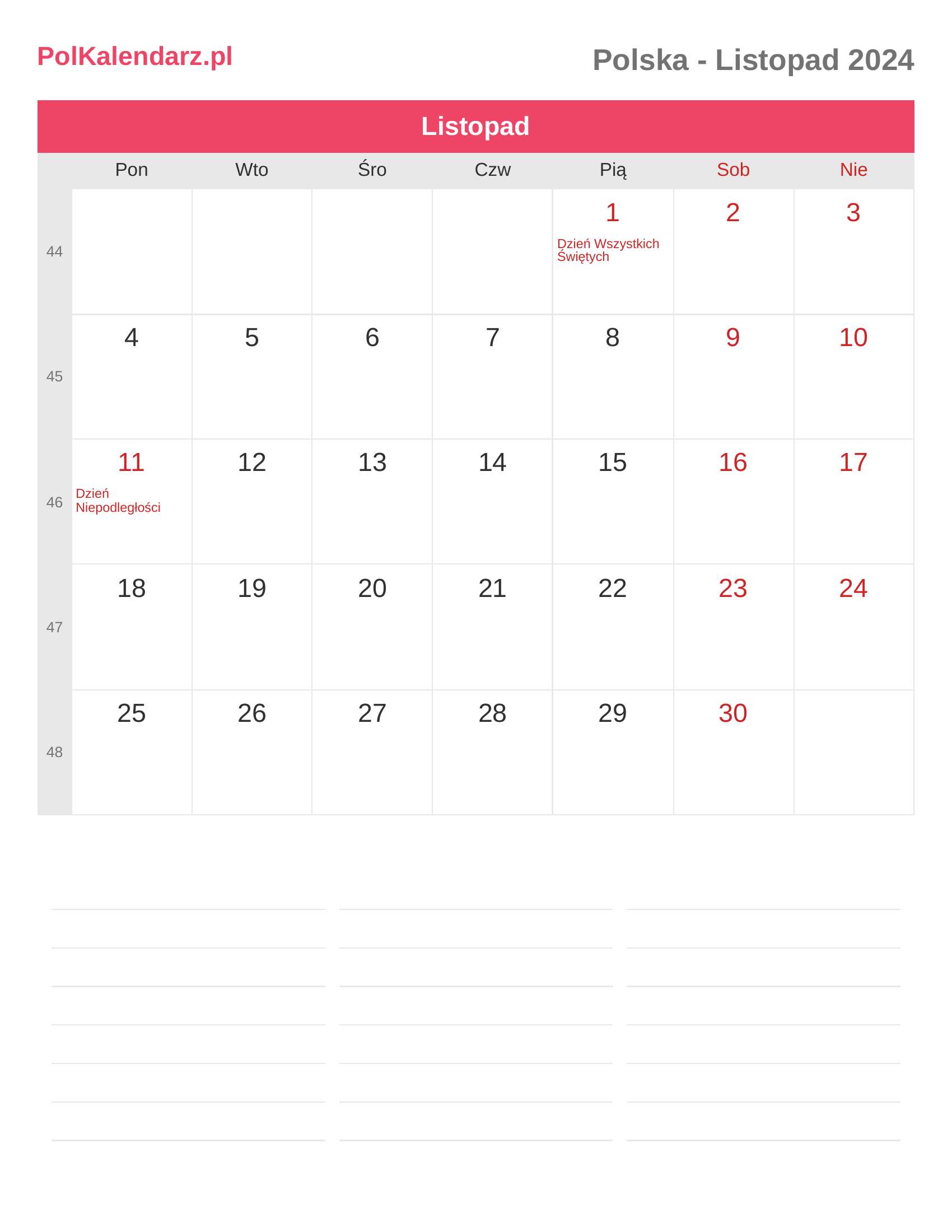 Kalendarz Listopad 2024 - Polska