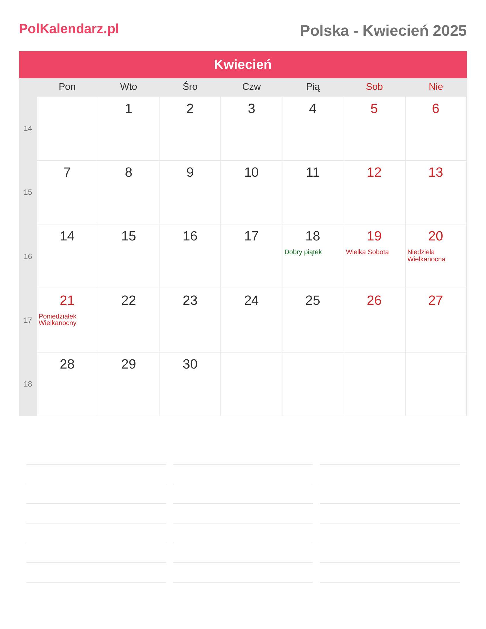 Kalendarz Kwiecień 2025 - Polska