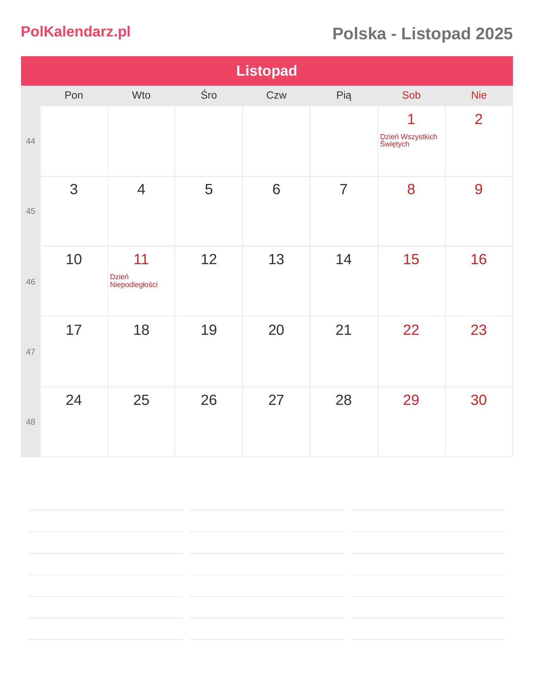 Kalendarz Listopad 2025 - Polska