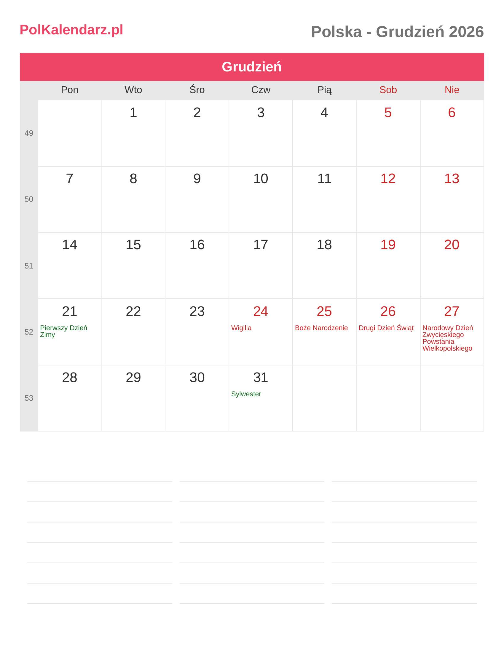 Kalendarz Grudzień 2026 - Polska