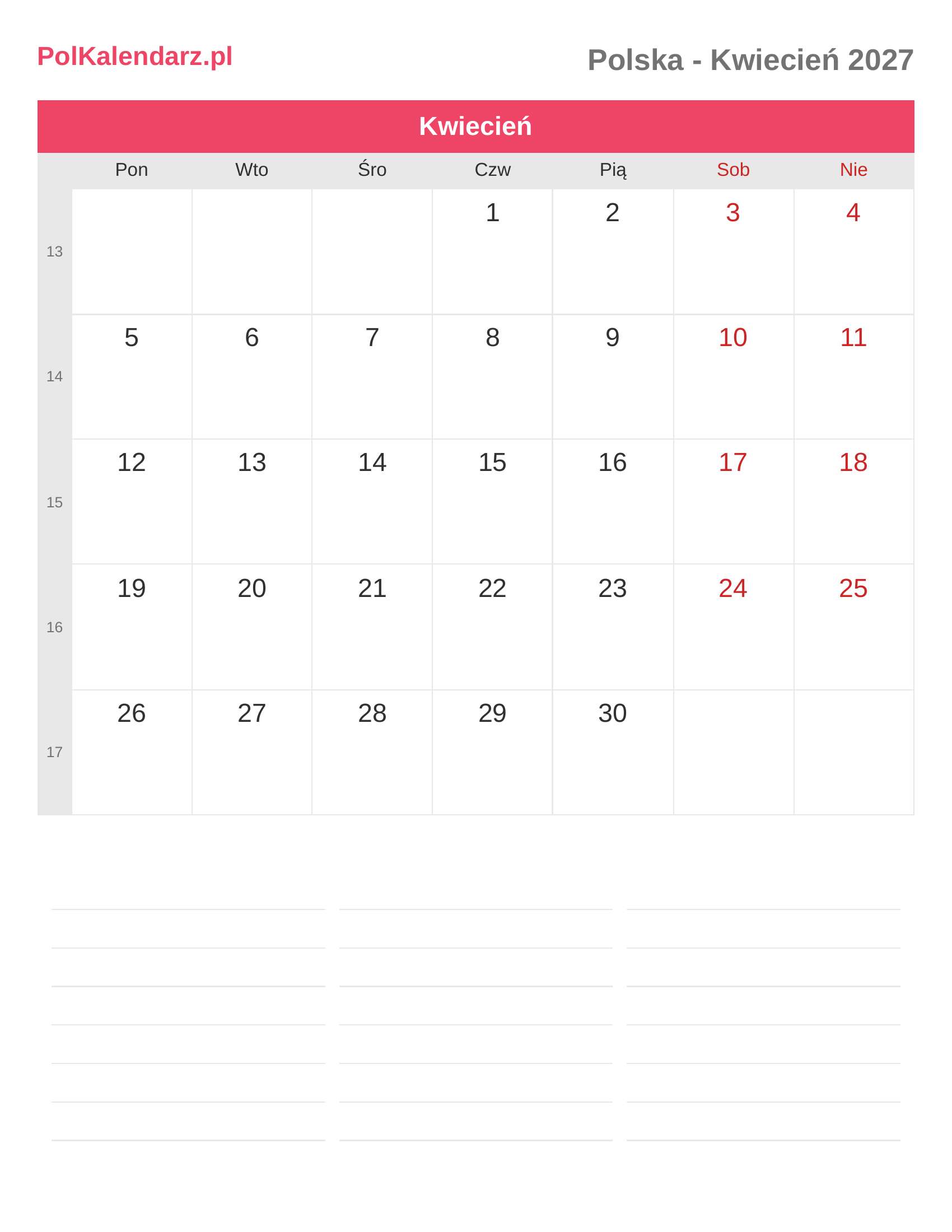 Kalendarz Kwiecień 2027 - Polska