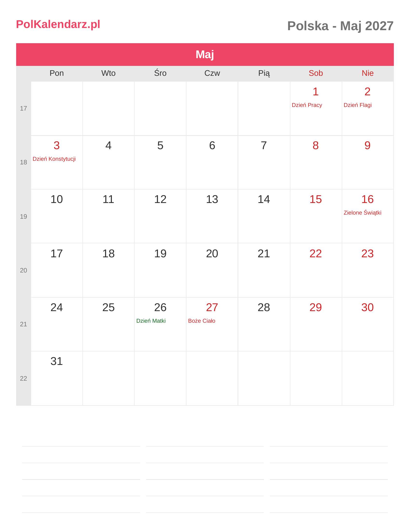 Kalendarz Maj 2027 - Polska