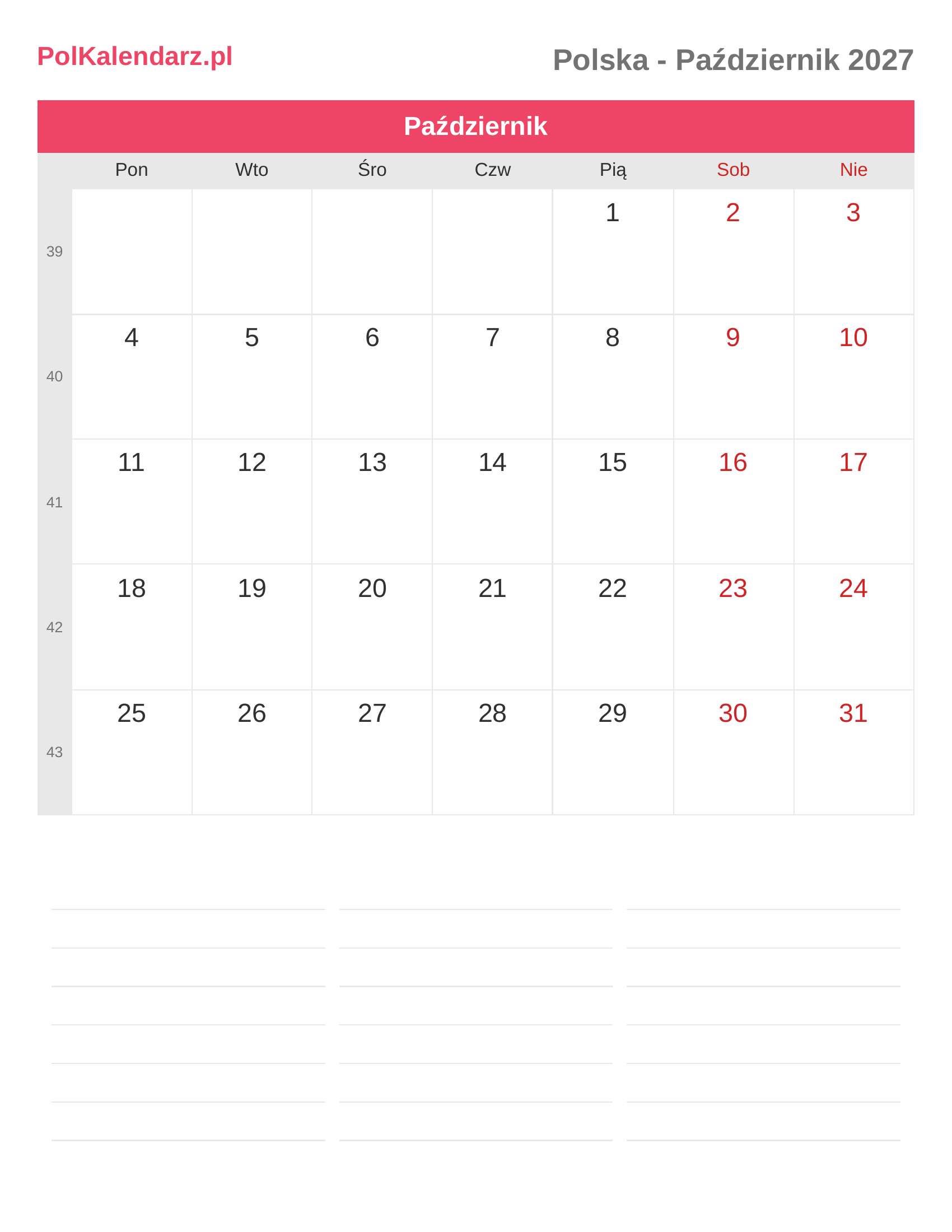 Kalendarz Październik 2027 - Polska