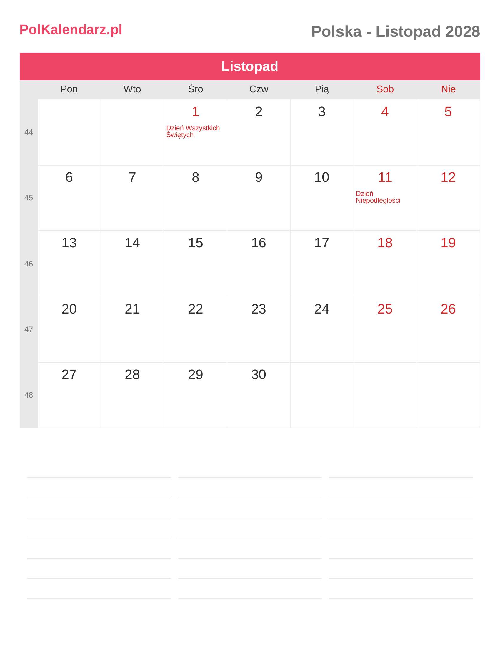 Kalendarz Listopad 2028 - Polska