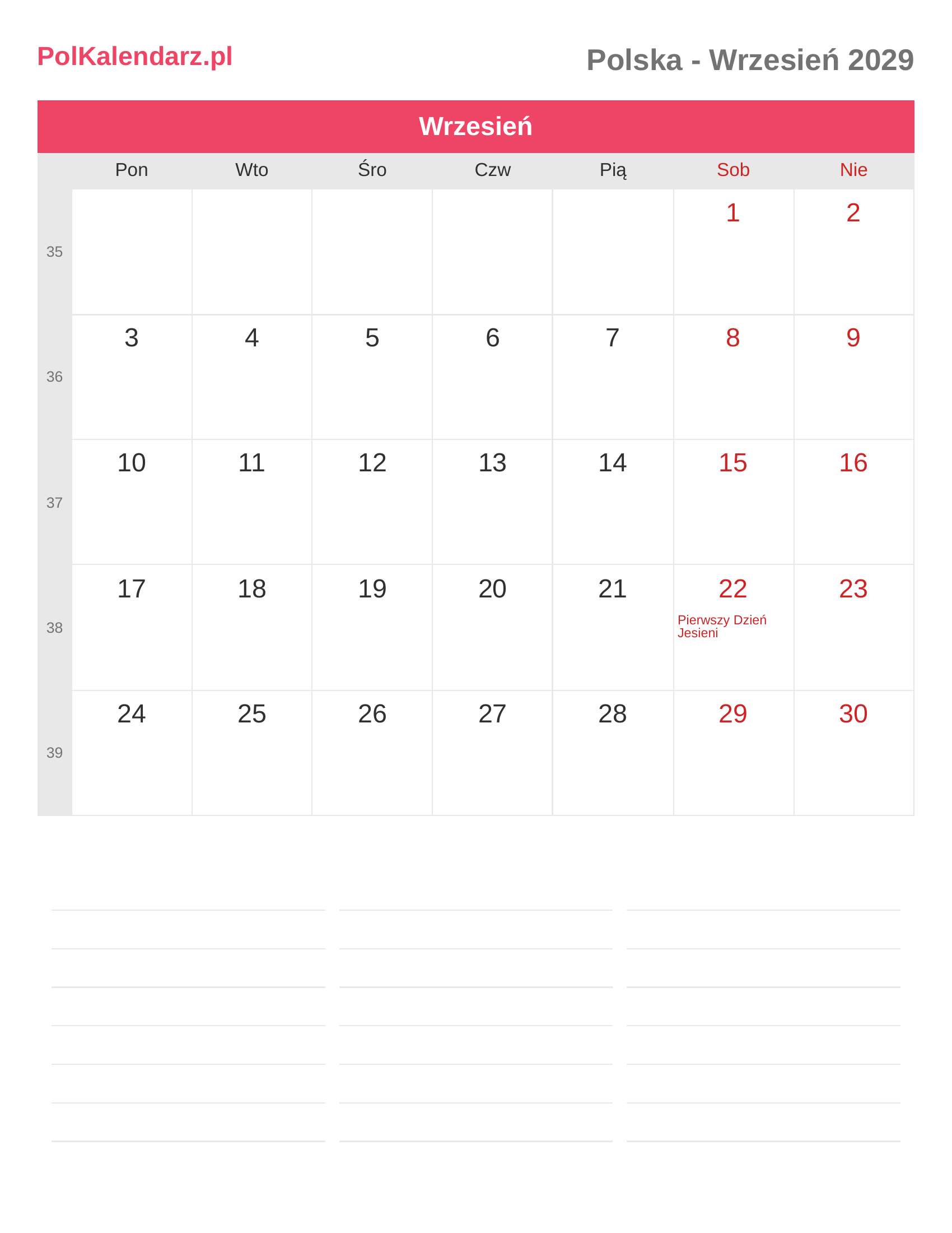 Kalendarz Wrzesień 2029 - Polska